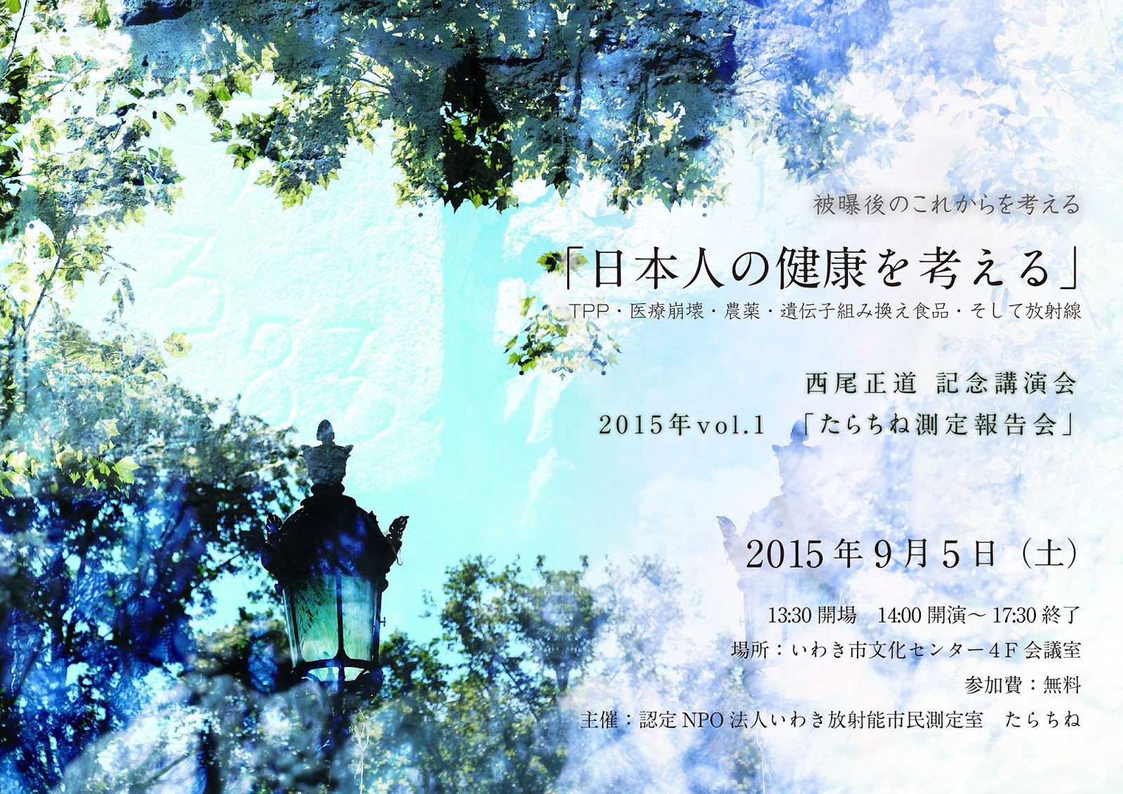 主催/問合わせ:認定NPO法人いわき放射能市民測定室「たらちね」〒971-8162いわき市小名浜花畑町11番地の3