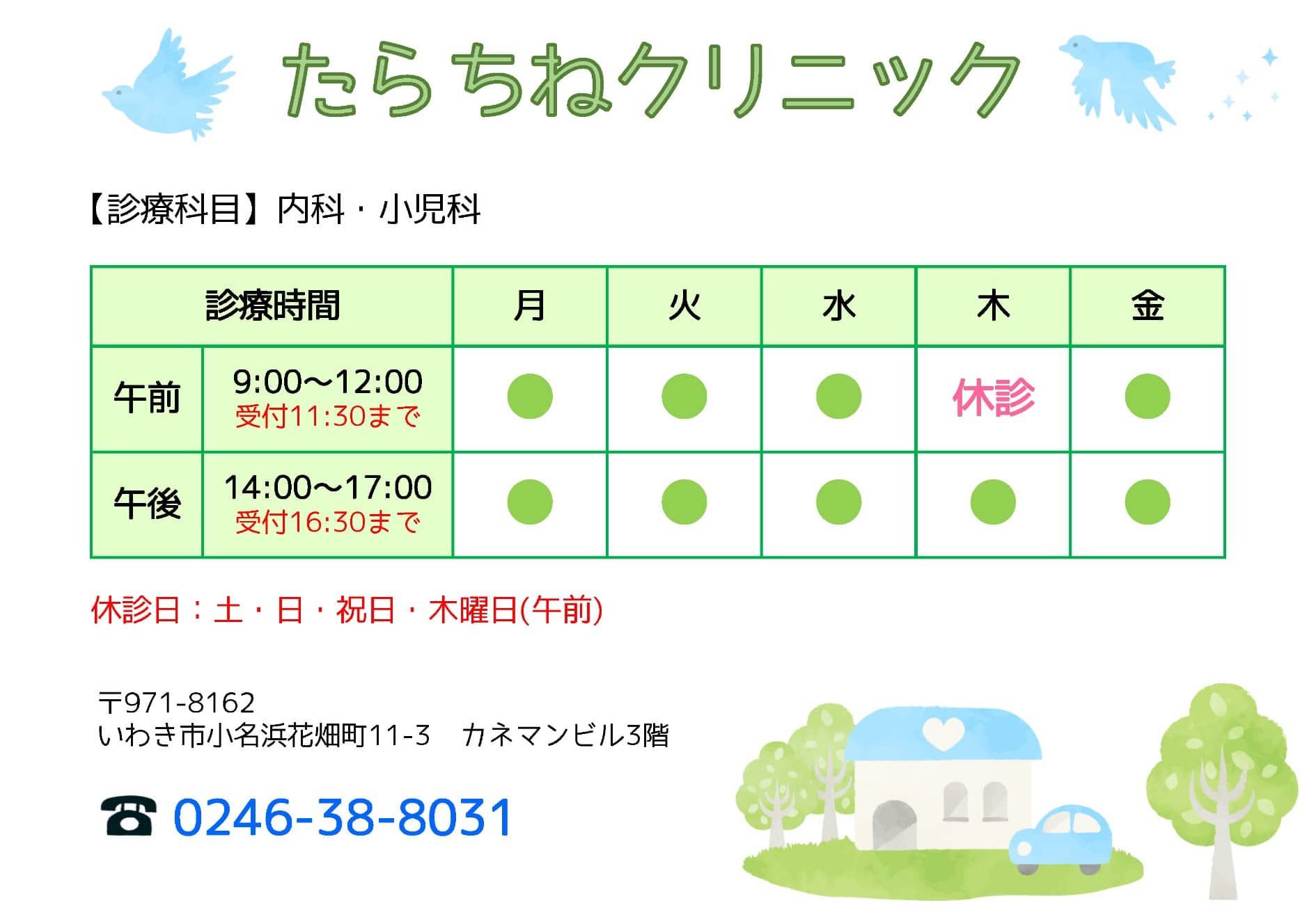 | 診療内容 | 予防接種、甲状腺検診、健康診断各種など |