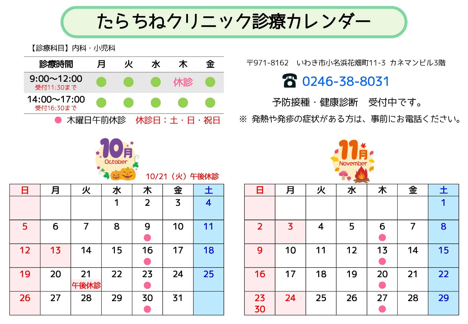 | 診療カレンダー | 10月・11月の診療カレンダー(PDF) |