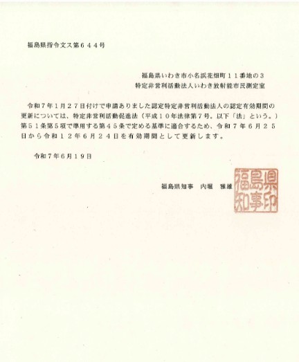 公益性の高い団体である「認定NPO法人」として福島県から認可を受けています。