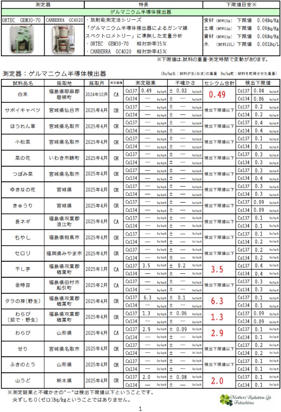 多くの親御さんが、親戚の方からいただいた地元の野菜などを不安そうな顔で持ち込まれます。そんな親御さんたちは、放射能が検出されなかったと知ると、安心した表情で帰っていかれます。放射能測定の概要 測定器台数 10台(2025年4月時点) 測定核種 セシウム134/137、ストロンチウム90、トリチウム、マンガン54、鉄59、コバルト60、亜鉛65、セリウム144、ルテニウム106、ニオブ94 放射能