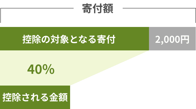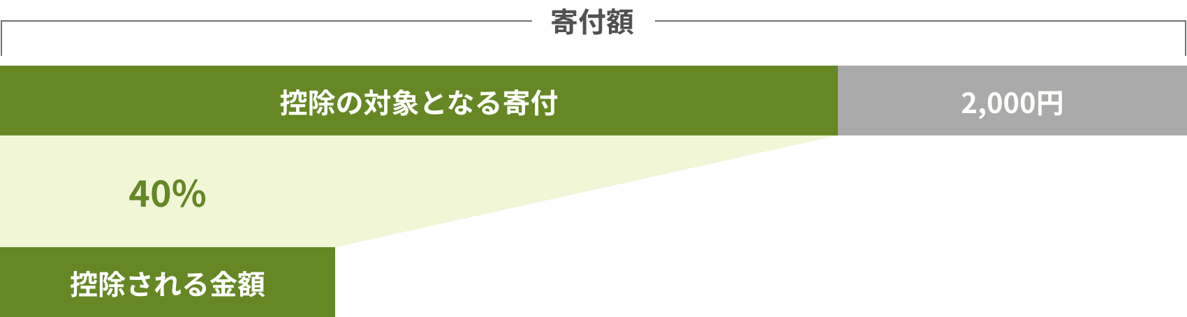 例えば、月々1,000円のご寄付の場合、年間の合計寄付金額である12,000円から2,000円を引いた金額の40%に当たる4,000円が所得税から控除(上限あり)され、実質の負担額は8,000円となります。