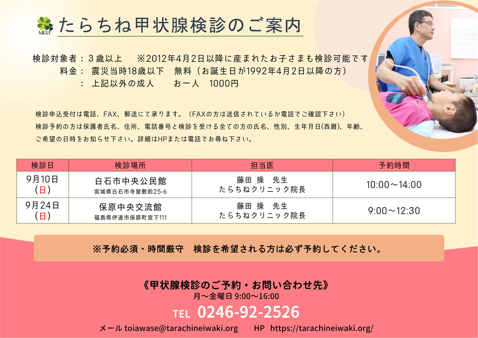 東日本大震災による原子力発電所の事故は、福島県と近隣の地域に深刻な健康被害の不安をもたらしました。たらちねでは、2013年3月から「たらちね甲状腺検診プロジェクト」を開設し、福島県内を中心に甲状腺の病気の不安に向き合う子どもたちを対象に、検診活動を実施してきました。検診の際には医師による丁寧な説明を行い、検診報告書と甲状腺の写真をお渡ししております。