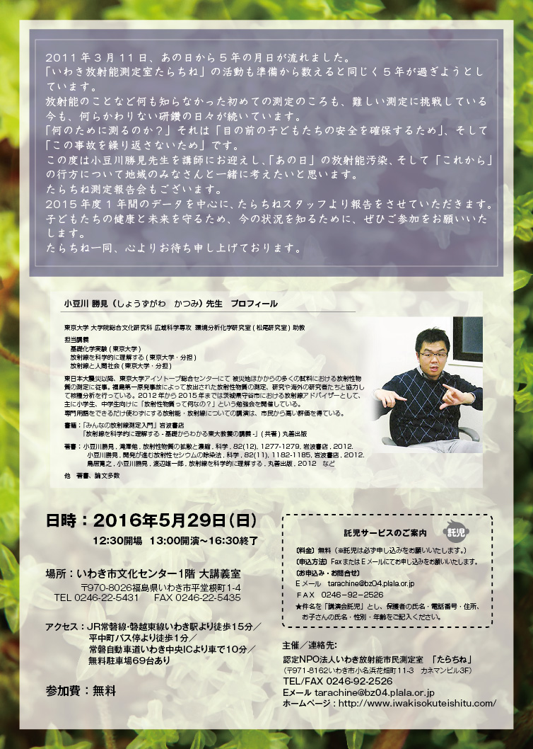 主催/問合わせ:認定NPO法人いわき放射能市民測定室「たらちね」