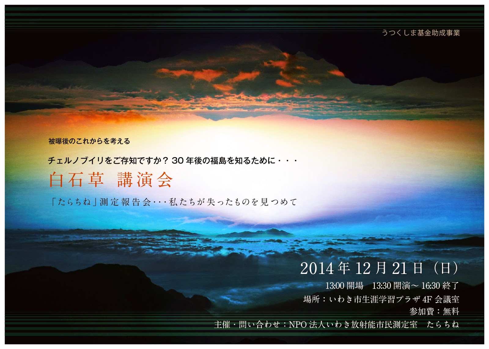 自分たちに今、何ができて、何を行うべきかをチェルノブイリの今を取材されてきた白石草さんのお話を聞き学び、私たちと一緒に考えてください。