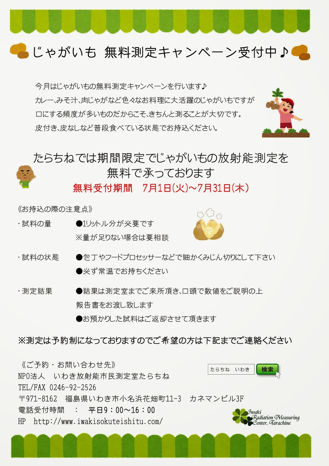 今回たらちねでは期間限定でじゃがいもの放射能測定を無料でお受けいたします!